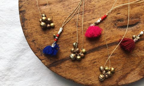 いろんな鈴とタッセルを使った大人っぽいネックレス。 背中に下がるタッセルがポイント。 後ろ姿も褒められます。