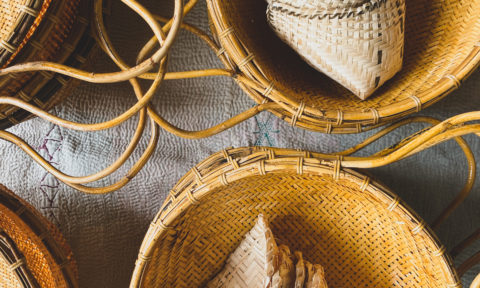 いつもは見たことのない、めずらしいものを探し求めていますが、今回のテーマは日用品。 チェンマイの市場で見かける台所用品、特に自然素材の物を集めました。 竹製のザルや茶漉し、コーヒーフィルター。 水草素材のミニかごやコース